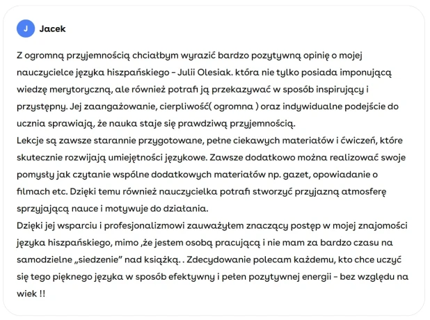 Nie obiecam ci cudów – nie nauczę cię hiszpańskiego w trzy miesiące, nie mam też sekretnej metody o magicznej nazwie, która sprawi, że w mgnieniu oka zaczniesz mówić płynnie. Ale mogę ci obiecać coś znacznie bardziej wartościowego. Poprowadzę cię krok po kroku przez świadomy, skuteczny i dostosowany do ciebie proces nauki. Będziemy budować solidne fundamenty, rozwijać umiejętności krokami, które mają sens, i odkrywać język hiszpański w sposób, który naprawdę działa – bez ściemy, bez zbędnych trików, za to z pełnym wsparciem i jasnym planem. Jeśli szukasz uczciwego podejścia i chcesz naprawdę nauczyć się hiszpańskiego, jestem tu, by ci w tym towarzyszyć.